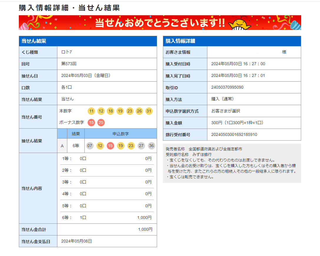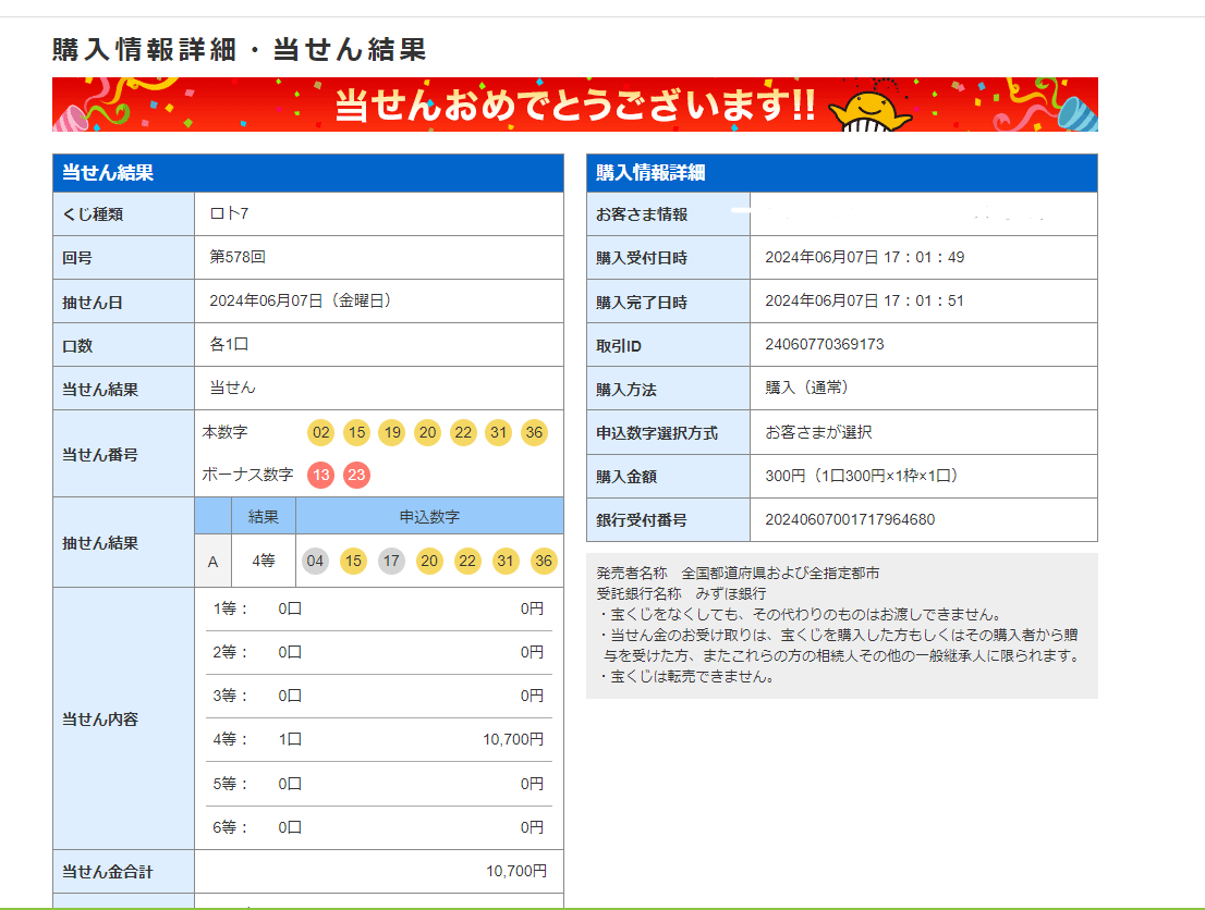 2024 6月 7日 ロト7 当たりました 5個 当った あと2つ